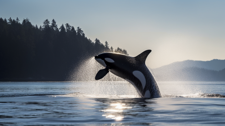 A majestic orca leaping from the ocean, droplets of water glistening in the sunlight, deep blue sea beneath with faint glimmers of sunlight, a feeling of freedom and grace.