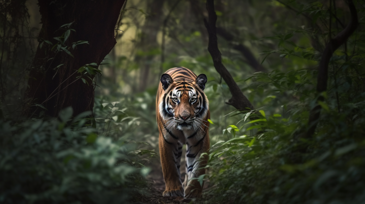 A majestic tiger walking through a dense jungle, lush greenery and ancient trees surrounding it, serene morning light filtering through leaves, creating a sense of peace and natural beauty.