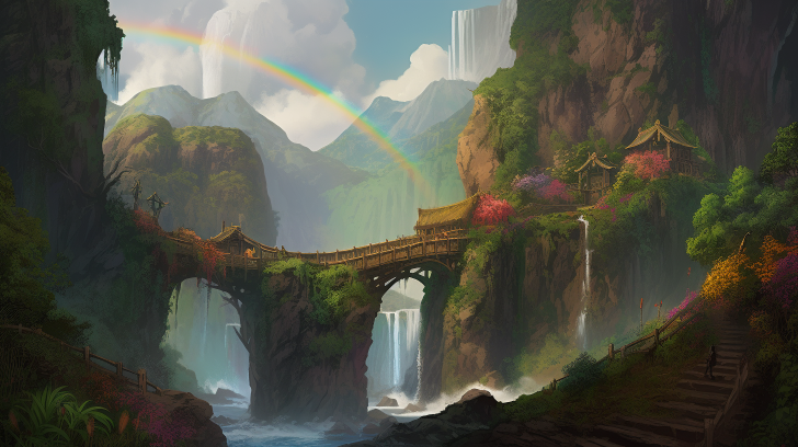 A waterfall cascading down a rugged mountain cliff, surrounded by lush greenery and misty clouds, a rainbow arcing across the sky, and a small wooden bridge.