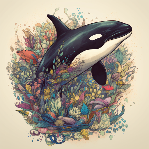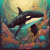 An orca swimming alongside its pod, vividly detailed, showing the intricate patterns on their skin, an underwater view with coral reefs and colorful fish, a sense of harmony and tranquility.
