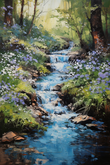 A tranquil brook cascading down a hillside, surrounded by lush spring greenery, using a sparkling blue, green, and brown palette.